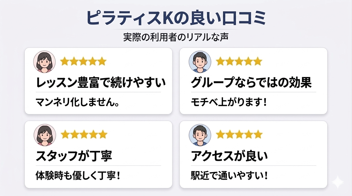 本記事では、Web上の膨大な口コミをもとに、ピラティスKのリアルな評判や実際の効果について詳しく解説していきます。
