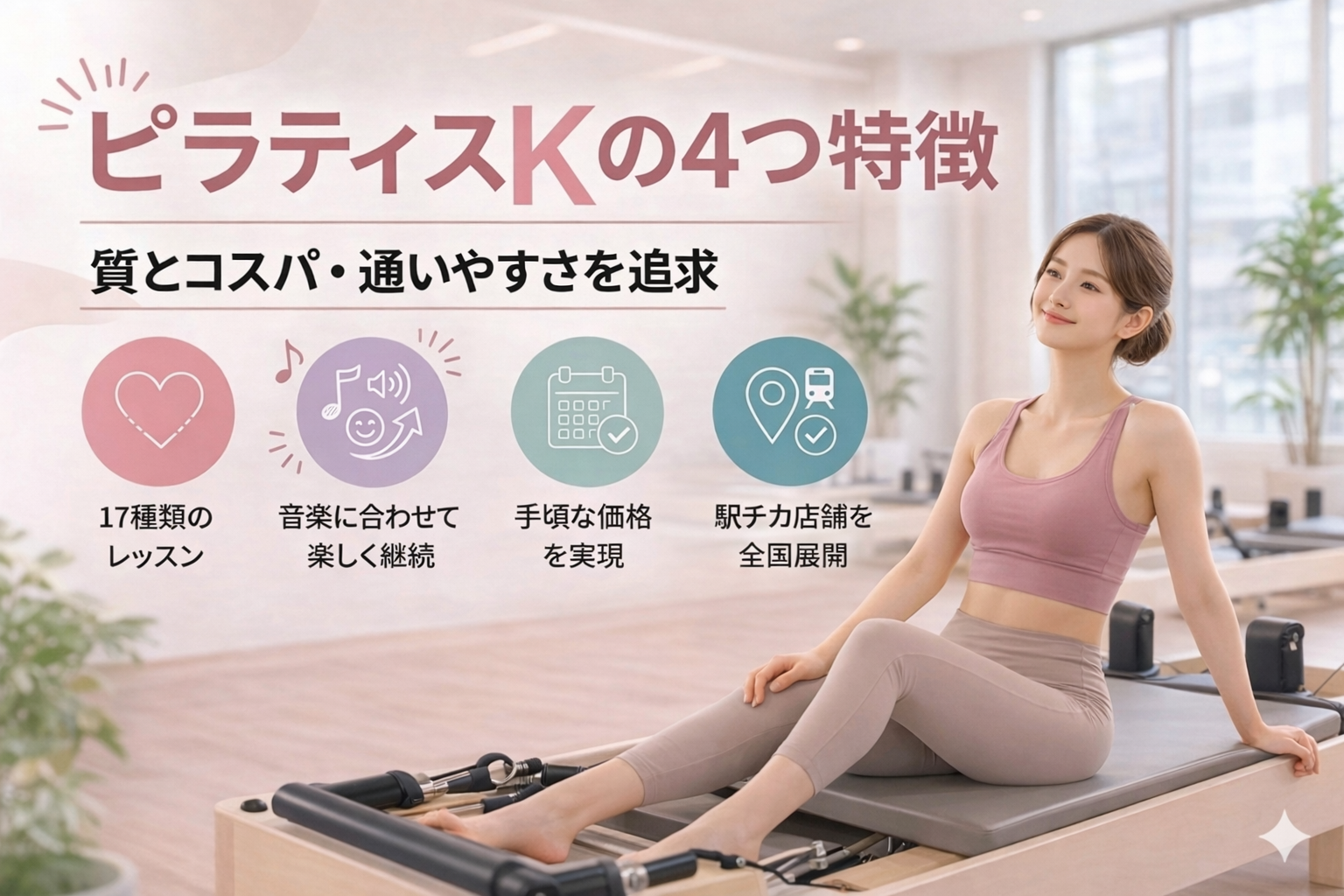 ピラティス Kの4つの特徴|通いやすい料金プランや駅チカ店舗が唯一無二の魅力